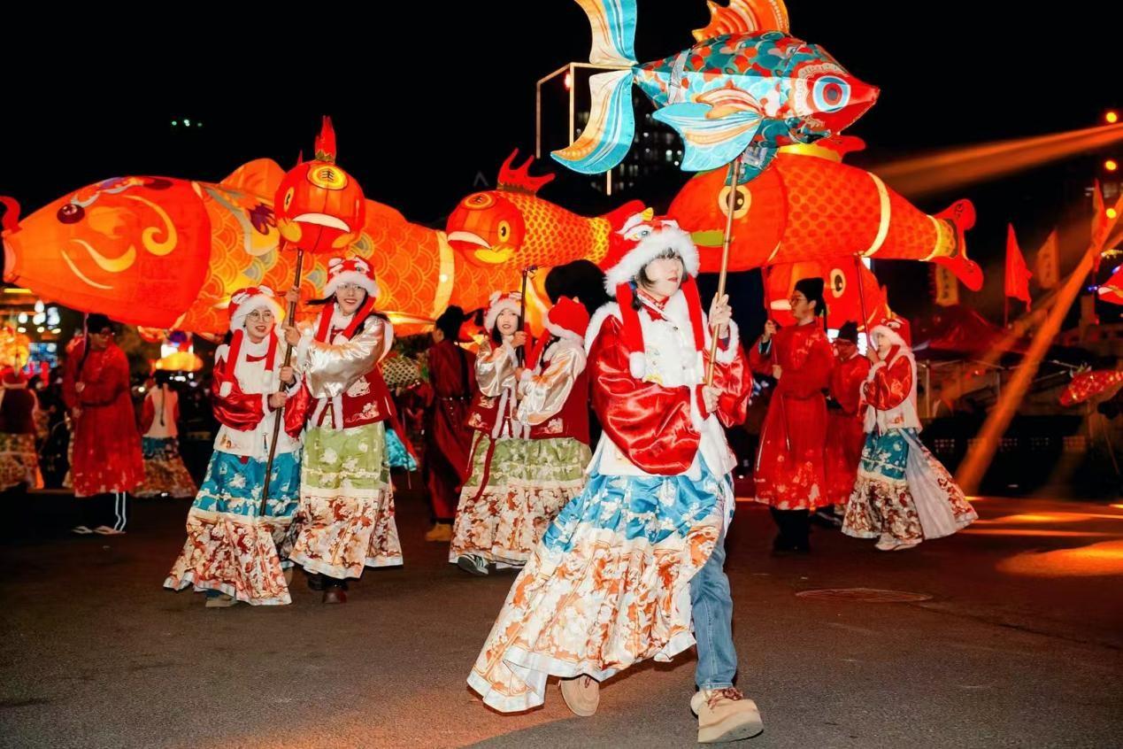 老新浦风情街区的元宵氛围相同浓厚,多条巨型鱼灯从民主路老街、陇海步行街至盐河巷渐渐“游”行,通体透亮的鱼灯摆尾间宛若活鱼跃水,让市民搭客近距离感受非遗之好意思。盐河巷专场水韵国潮夜演“西游上元奇遇记”东谈主气爆棚,孙悟空从天而下,猪八戒、沙僧与不雅众欢笑互动,飞天青娥凌波起舞,国潮新民乐与传统唐风跳舞按序登场,传统艺术与当代舞台时刻井水不犯河水,带不雅众“破次元”走进魔幻西游宇宙。