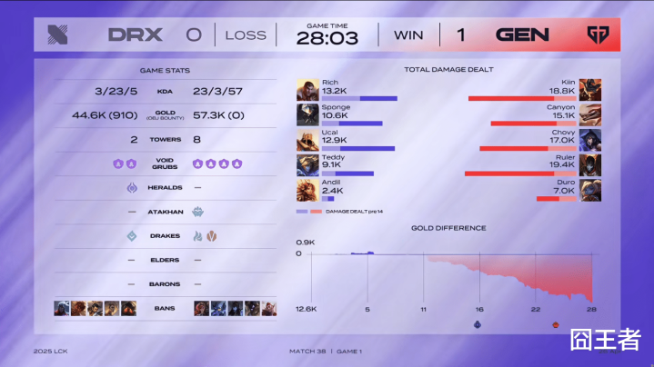 后果第一局比赛,很容易的就被GEN打成了片面的碾压局。3分钟驾驭:两边登程对拼,Sponge蝎子gank持死残血兰博;8分钟驾驭:Sponge蝎子持中,被Chovy狐狸残血潜逃,且沙皇被赶来的纳亚菲利收掉,Sponge蝎子也被留下击杀;11分钟驾驭:DRX开打潮虫,但被绕后的Chovy狐狸包夹,GEN打出一波0换3;20分钟驾驭:Ucal沙皇强开狐狸失败,GEN反击打出0换3;25分钟驾驭:Canyon纳亚菲利野区逮到契机,合营队友先杀女坦随后队友跟上再杀蝎子沙皇;最终28分03秒,GEN一波团灭DRX,先赢一局!