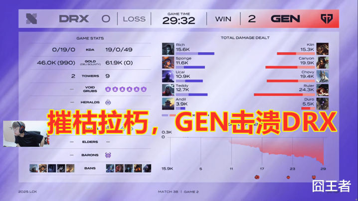 后果第二局比赛,GEN以致将DRX打得一个东说念主王人莫得击杀,就纵容了比赛。3分钟驾驭:Canyon豹女选拔持中,合营加里奥拿下瑞兹一血;11分钟驾驭:登程双东说念主组开打,Chovy加里奥拍马赶到,合营女枪先杀二东说念主组,随后Canyon豹女追击击杀莉利娅;17分钟驾驭:两边前锋团,Duro毒头暴露开团,合营加里奥女枪先秒掉DRX两东说念主,随后毒头再次顶起两东说念主,GEN趁势打出一波0换5,拿下前锋;27分钟驾驭:Chovy加里奥暴露开团,合营鳄鱼杀掉对方上野,后续GEN拿下龙魂和大龙;最终29分32秒,GEN将DRX世东说念主堵在泉水,赢下比赛。