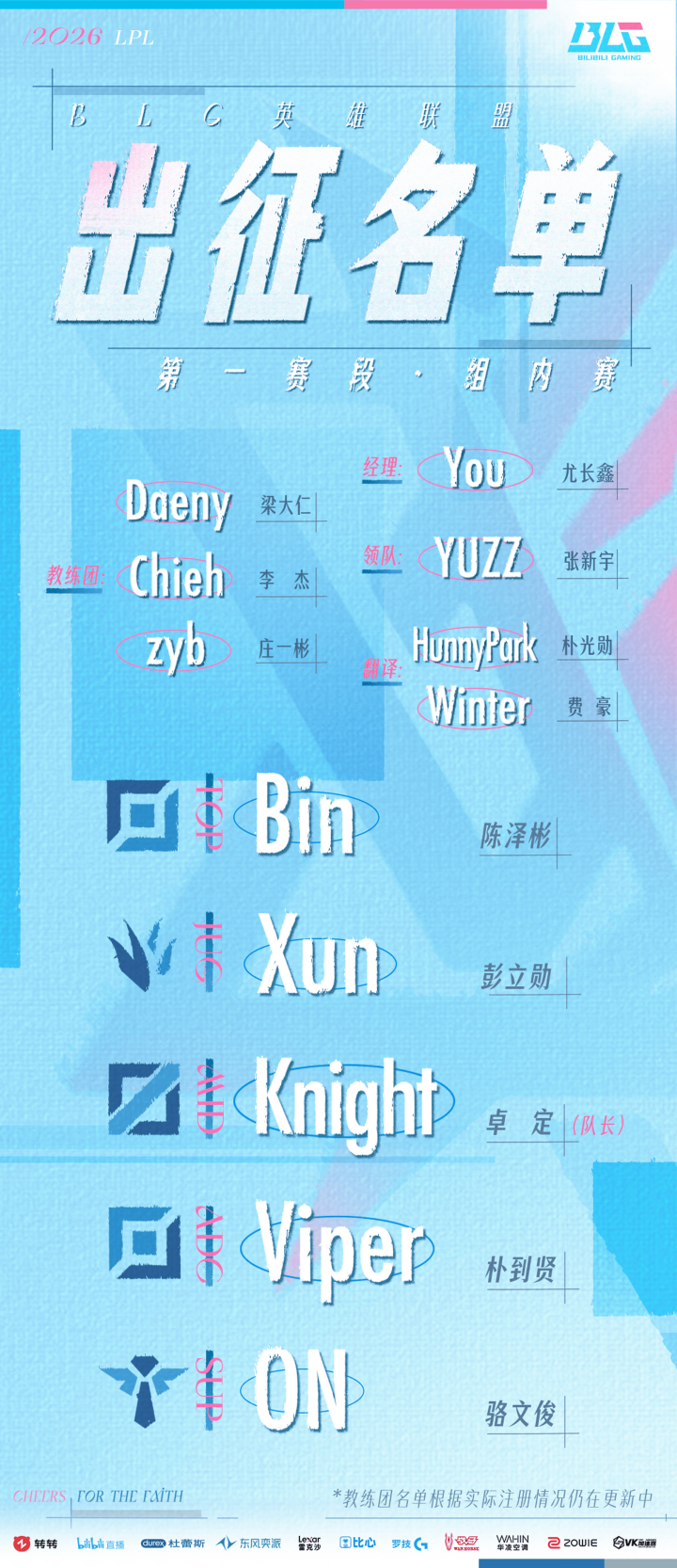 你的位置:ky体育官网登录入口网页版(中国)有限公司官网 > 娱乐 > 开云体育(中国)官方网站BLG公布新赛季大名单: Bin/Xun/Knight/Viper/ON, 培植Daeny-ky体育官网登录入口网页版(中国)有限公司官网
