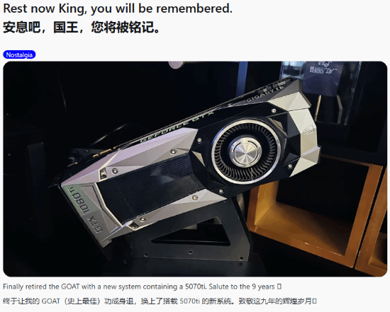 海外PC硬件瞻仰者社区r/pcmasterrace中,有玩家共享了我方的硬件更新阅历。这位用户使用了9年的GTX1080Ti矜重角巾私第,他为此配文致意体育游戏app平台,称这款显卡为硬件圈的GOAT,同期换上了搭载RTX5070Ti的全新电脑平台。