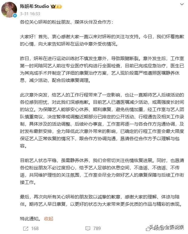 手术后第二天,也便是3月31日,陈妍希责任室发出了精采声明。