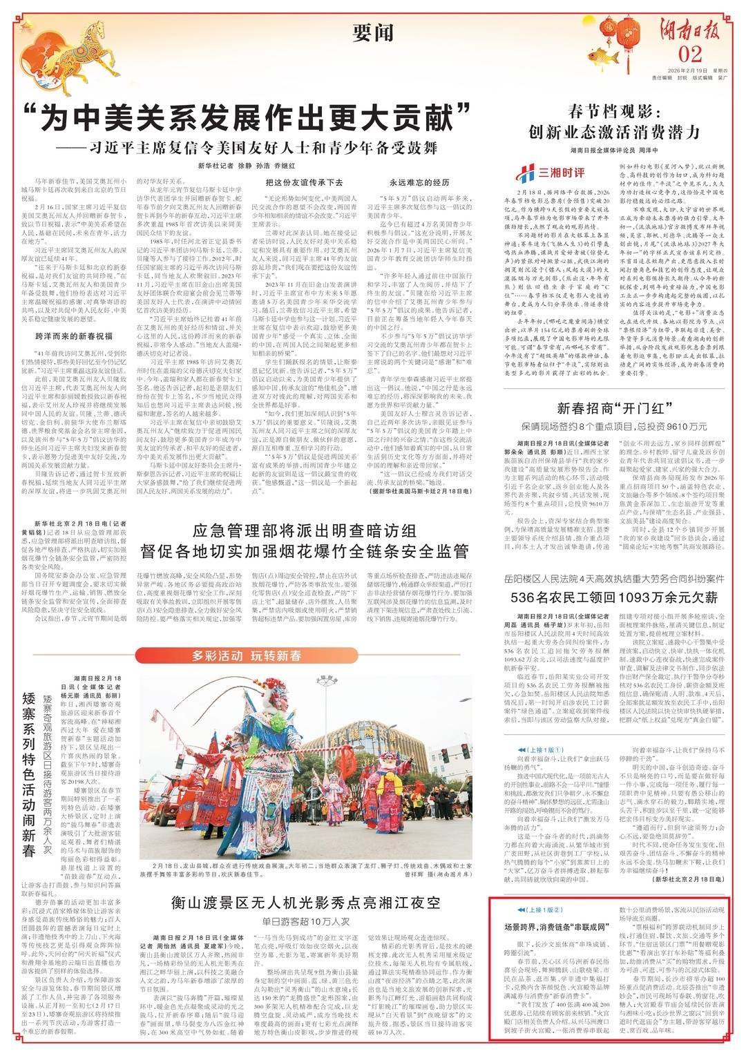 春节时辰,长沙市将举办超100场要点促奢华步履。北辰荟推出“非遗妙会”,市民可现场写对子、剪窗花、吹糖东说念主;火宫殿春节庙会延续俗例饰演与湘味小吃;长沙寰宇之窗以“回到辛追期间逛庙会”为主题,带旅客穿越历史、赏散乐、品年味。