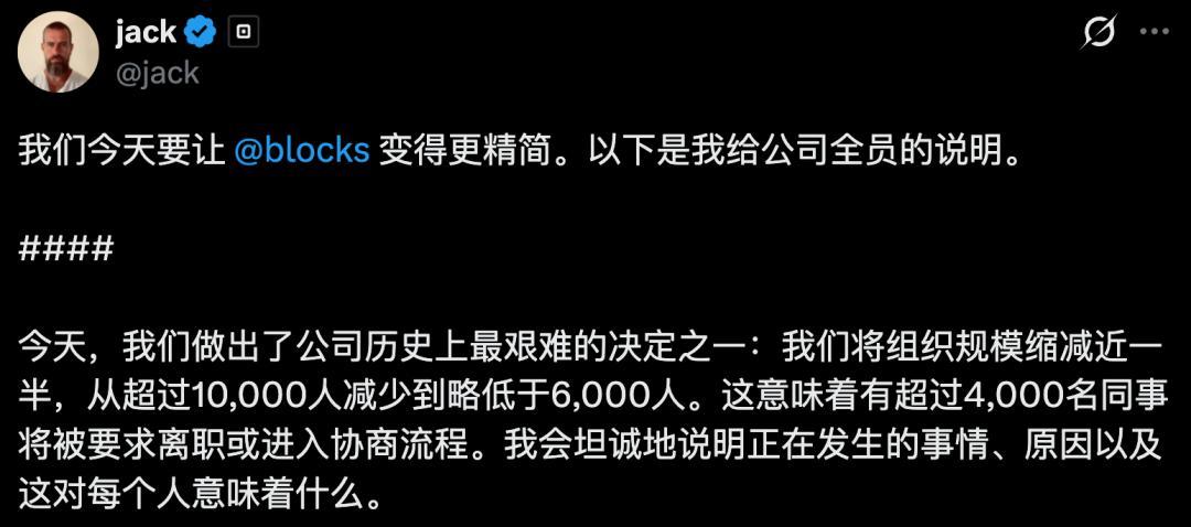 2月27日,Block CEO Jack Dorsey通知裁人跨越4000东谈主,从10000多东谈主砍到不到6000东谈主。40%的职工,说没就没了。