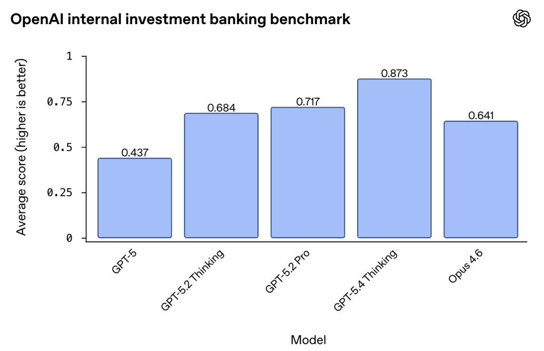 在OpenAI里面的投行基准测试中,GPT-5.4 Thinking的得分从初代GPT-5的43.7%飙到87.3%,翻了一倍。
