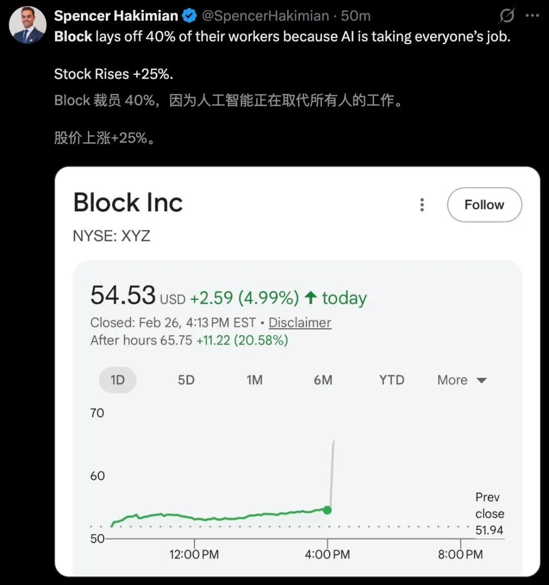 市集的响应?Block股价盘后一度暴涨25%,市值加多约80亿好意思元。