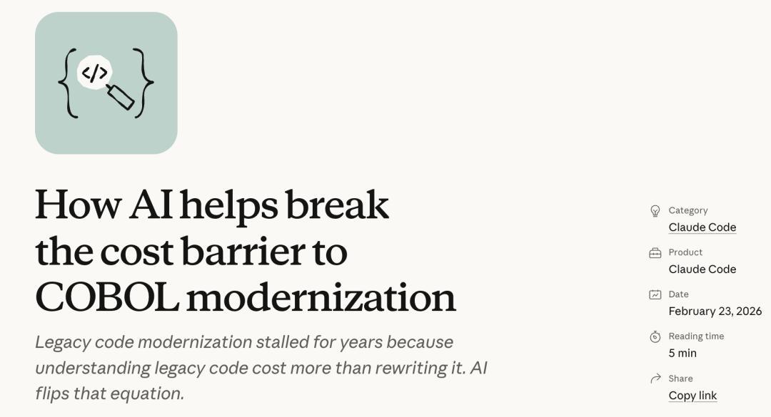 Anthropic官宣Claude Code不错自动化COBOL代码的当代化改良。今日,IBM股价暴跌13.2%,2000年以来最惨的一天。